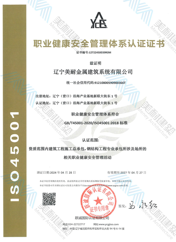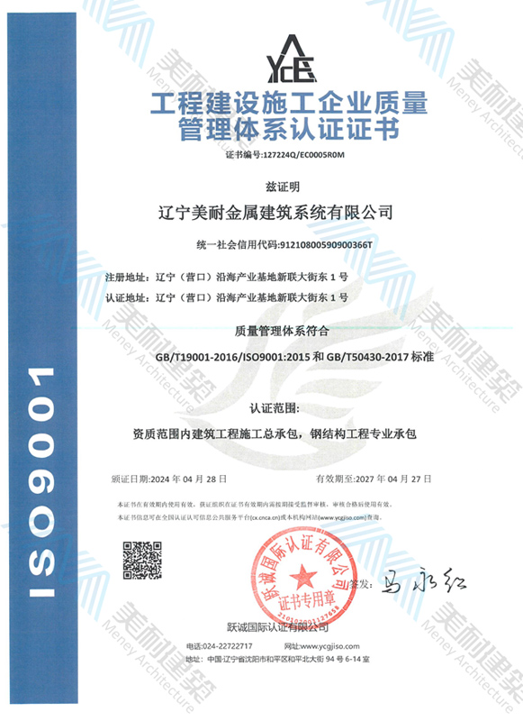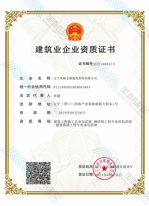 遼寧美耐金屬建筑系統(tǒng)有限公司位于遼寧(營(yíng)口)沿海產(chǎn)業(yè)基地,專注于預(yù)制金屬建筑系統(tǒng)領(lǐng)域,是一家集工業(yè)建筑設(shè)計(jì)、制作、施工及相關(guān)的技術(shù)咨詢與服務(wù)為一體的綜合性服務(wù)企業(yè)。作為國(guó)家鋼結(jié)構(gòu)協(xié)會(huì)會(huì)員、中國(guó)建筑金屬結(jié)構(gòu)協(xié)會(huì)會(huì)員單位與國(guó)家高新技術(shù)企業(yè),美耐建筑集建筑工程施工總承包、鋼結(jié)構(gòu)工程專業(yè)承包等多種資質(zhì)于一身,并擁有22項(xiàng)鋼結(jié)構(gòu)建筑領(lǐng)域?qū)@?項(xiàng)軟件著作權(quán)。